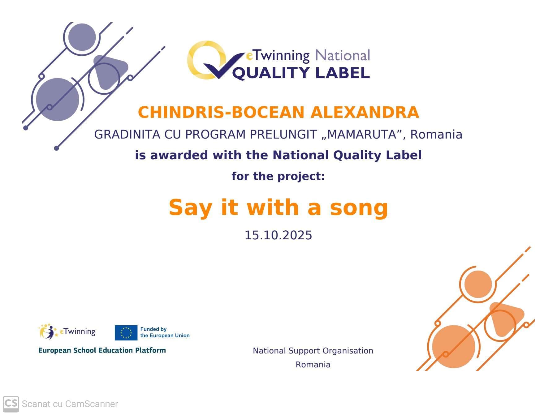 Proiectul „Say it with a Song” a reunit parteneri din Albania, Grecia, Turcia și România, implicând 9 grădinițe și 15 cadre didactice. Activitățile s-au desfășurat pe o perioadă de 8 luni (octombrie – mai), iar copiii participanți au avut vârste cuprinse între 4 și 6 ani.
